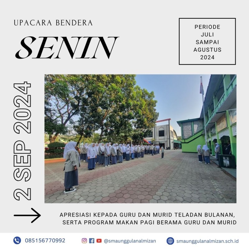 SMA Unggulan Al-Mizan melaksanakan upacara bendera yang berlangsung dengan khidmat di lapangan sekolah. Dalam upacara tersebut, Kepala Sekolah, KH. M. Zaenal Muhyidin, S.Ag., MM., bertindak sebagai pembina upacara dan memberikan pidato inspiratif yang memotivasi seluruh siswa dan guru untuk terus berprestasi. Momen spesial terjadi ketika kepala sekolah memberikan apresiasi kepada Cecep A. Rahman, S.Pd, yang terpilih sebagai guru teladan, serta Anya Fitriani Suryana sebagai murid teladan. Pengumuman ini disambut dengan tepuk tangan meriah dari seluruh peserta upacara. Senin, (2/9/24).