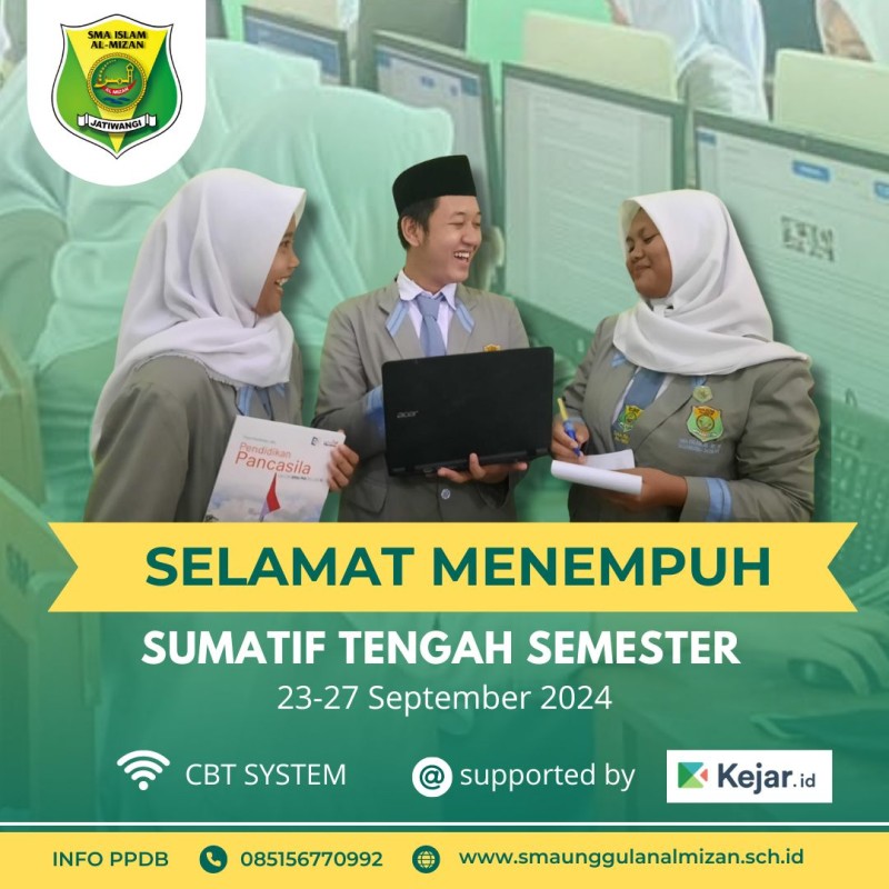 SMA Unggulan Al-Mizan kembali menyelenggarakan kegiatan Sumatif Tengah Semester (STS) yang berlangsung mulai tanggal 23 hingga 28 September 2024. Kegiatan ini diikuti oleh seluruh siswa dari kelas 10, 11, dan 12 dengan tujuan untuk mengukur pencapaian kompetensi belajar selama setengah semester.