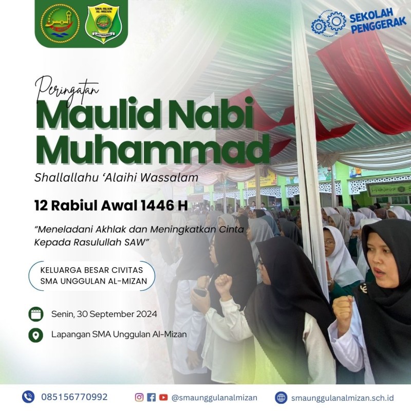 Dalam rangka memperingati hari kelahiran Nabi Muhammad SAW, SMA Unggulan Al-Mizan menggelar acara Maulid Nabi yang dihadiri oleh keluarga besar civitas sekolah serta tamu undangan. Acara ini bertujuan tidak hanya sebagai peringatan Maulid Nabi, tetapi juga sebagai sarana untuk mempererat silaturahmi antar seluruh komponen sekolah, meliputi guru, siswa, staf, dan tamu undangan yang hadir, termasuk tokoh masyarakat dan perwakilan dari Yayasan Al-Mizan. Senin, (30/9/24).