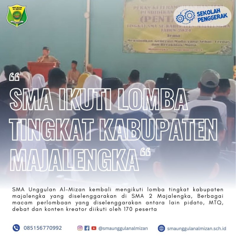 Semangat pagi dari SMA Unggulan Al Mizan kembali hadir dalam ajang tahunan PENTAS PAI 2024 tingkat SMA se-Kabupaten Majalengka, yang diselenggarakan oleh Musyawarah Guru Mata Pelajaran Pendidikan Agama Islam (MGMP PAI) Majalengka di SMA Negeri 2 Majalengka. Mengusung tema “Mewujudkan Generasi Muda yang Sehat, Cerdas, dan Berakhlak Mulia,” kegiatan ini berlangsung pada 2 November 2024. Sabtu (2/11/24)