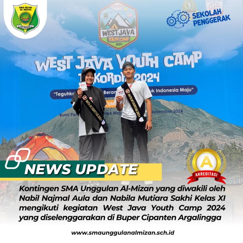 Kontingen SMA Unggulan Al-Mizan yang diwakili oleh Nabil Najmal Aula dan Ketua OSIS Nabila Mutiara Sakhi, berhasil menyelesaikan rangkaian kegiatan West Java Youth Camp 2024 yang berlangsung dari tanggal 7-9 November 2024 di Bumi Perkemahan Cipanten Argalingga. Acara ini digelar dalam rangka memperingati Hari Antikorupsi Sedunia (HAKORDIA) dan bertujuan untuk memperkuat kesadaran generasi muda terhadap pentingnya nilai-nilai integritas.