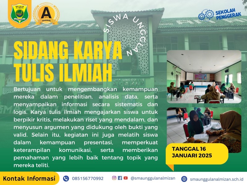 Sidang Karya Tulis Ilmiah (KTI) yang digelar di SMA Unggulan Al-Mizan pada 15 hingga 20 Januari 2025 menjadi momen penuh tantangan bagi siswa-siswi kelas XII. Rangkaian kegiatan ini tak hanya menjadi ajang untuk menunjukkan hasil penelitian mereka, tetapi juga untuk menguji kemampuan presentasi, berpikir kritis, dan mempertahankan pendapat di hadapan dewan penguji.